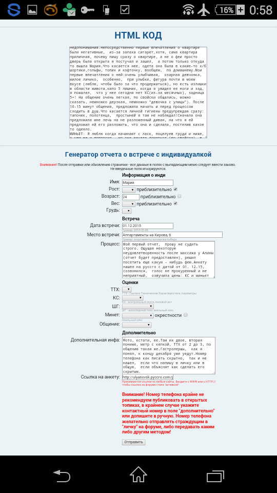 Админ, Привет, никак не могу опубликовать отчет через генератор отчетов, нажимаю запустить, появляется страница, вот так будет выглядеть ваш отчет, где снизу тот же генератор с пустыми полями ТТХ, ШГ. и т.д. заполняю их заново, нажимаю отправить и опять страница с тем же содержанием и пустыми полями.Помогите решить проблему.
