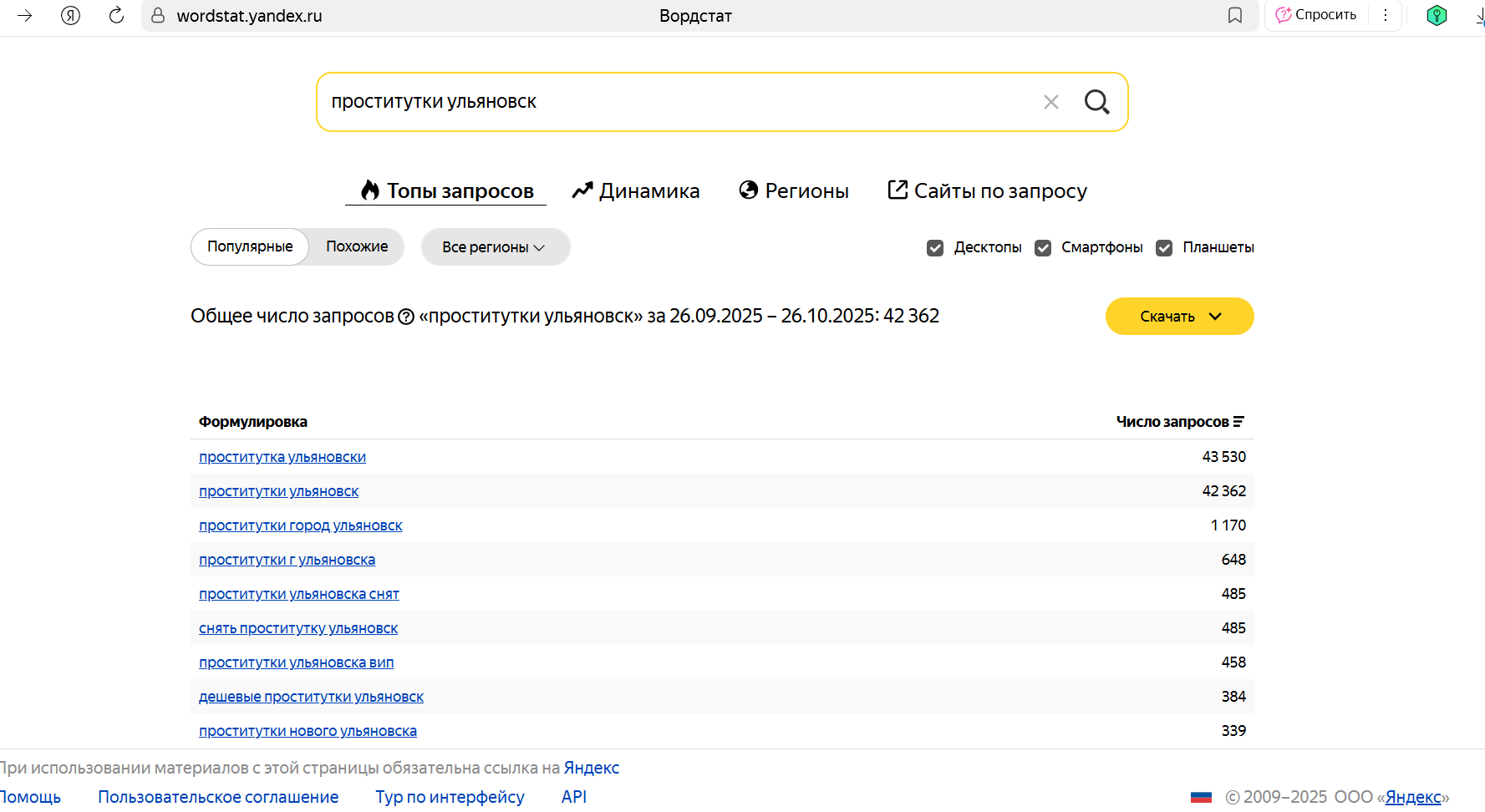 Не может быть такого, может у них ценник 15 тысяч в час? Тогда да, им придется долго ждать звонков. По моему опыту к некоторым невозможно попасть вообще, сколько не звони и не пытайся договорится и это может продолжаться неделями а то и месяцами. Запрос "проститутки ульяновск" 43 000 судя по Вордстату Яндекса. И это на 600 тысяч населения. Спрос просто бешеный. Плюс животное желание секса у мужчин - очень мощный драйвер этого бизнеса. Короче про скучающих без клиентов фей слабо верится.bond писал(а): Насчёт отбоя от клиентов нет ну хз хз. Знакомые феи кого давно знаю как то пару раз брякнули что бывает и 1-3 заказа в неделю. То есть ни фига. Так что бешеные деньги это либо сильно раньше было либо город не перспективный. А это так как приработок к основному месту работы иметь