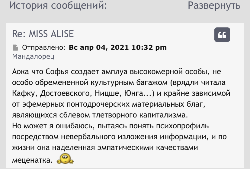 Касаемо Софии высказал предположение на основе всех этих прений не самого удачного созвона (там не было явных грубостей с обеих сторон если что), не просто так использовал слово амплуа, также подчеркнул, что неисключено ошибочность в суждениях, которые априори не претендуют на вердикт.