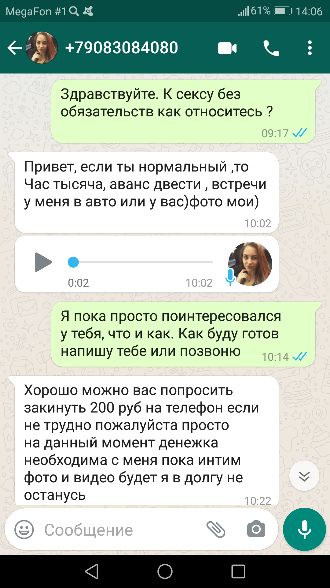 Позвонил второй раз уже на другой номер. Снова привлекла меня цена 1500р за час Приехал на Минаева 28. И тут тоже развод, опять переведи деньги на телефон, но уже 700р. Я после двух таких плюшек честно говоря был в дерьмовом настроении, помню прошел к почте напротив трамвайной остановки и решил сделать третий звонок. И вот тут мне повезло [url=https://4um.me.in/viewtopic.php?f=85&t=24431]Кристина 30-170-70[/url]