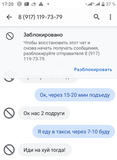 Позвонил ей, договорился о встрече через 15-20 мин, немного задержался, уже выехал, она ещё раз позвонила и сбросила, набрал ей сам но номер уже был недоступен,написал ей смс что уже еду и через 7-10 мин буду, получил от неё вот такую смс. Скриншот переписки с телефона приложил, там видно что смс с её номера. Конченая быдло шваль, отзывы правдивые про неё, раньше сам думал что её просто сутера и салоны потопить хотят, но нет эта тварь реально так себя ведет и полностью эти отзывы заслуживает.Fantomas писал(а): 2021-06-25 14:06 Натыкался на негативные отзывы (хамила, воровала) но сам такого за ней не замечал.