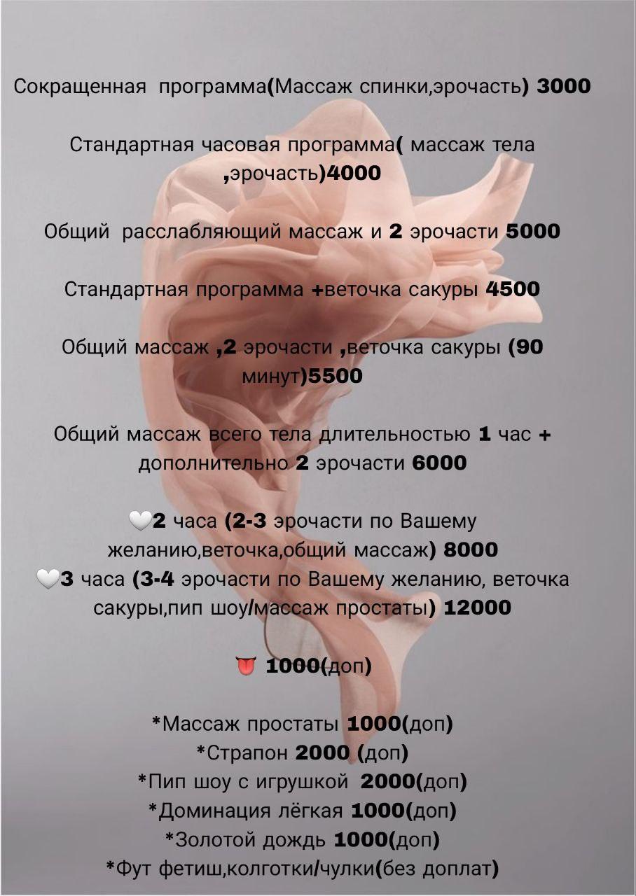 Также есть vip - 7.900 80 минут Максимально насыщенная эротически программа, в нее включено множество дополнений, которые можем обсудить лично по пожеланиям. Входит 1/2 окончания на выбор. Поцелуи яичек, ласки, поцелуи по телу, различные позы. Подробнее обсуждаем про встрече по пожеланиям